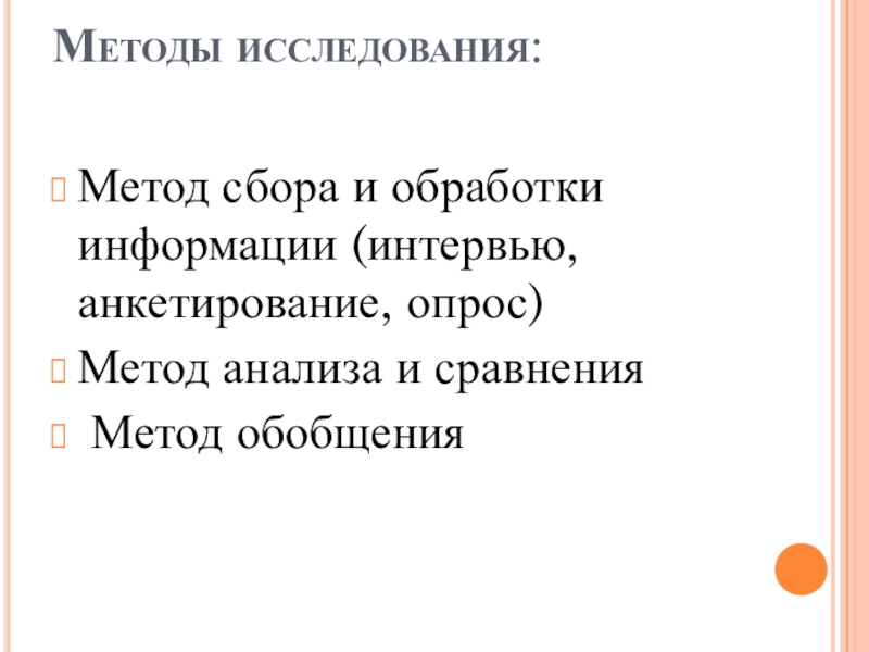 Методы исследования:  Метод сбора и обработки информации (интервью, анкетирование, опрос)Метод анализа и сравнения Метод обобщения