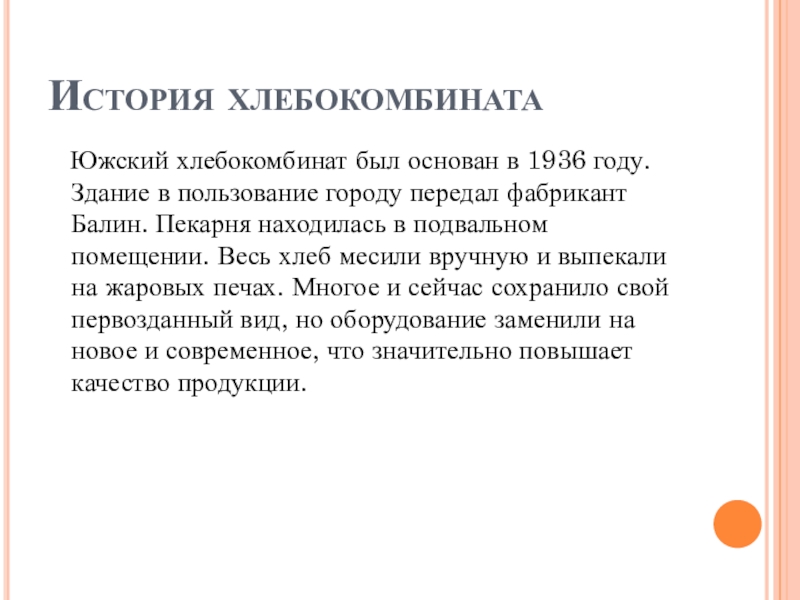 История хлебокомбината  Южский хлебокомбинат был основан в 1936 году. Здание в пользование городу передал фабрикант Балин.