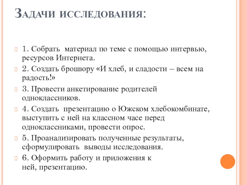 Цель: собрать и изучить информацию о Южском хлебокомбинате и рассказать о нем одноклассникам.