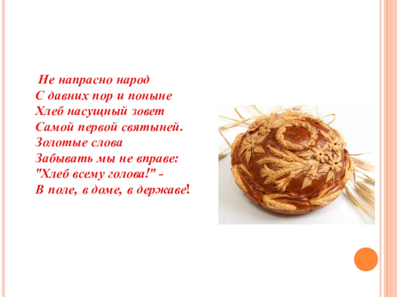 Слайд 2 Не напрасно народ С давних пор и поныне Хлеб насущный зовет Самой