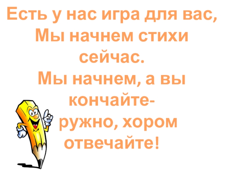 Есть у нас игра для вас,Мы начнем стихи сейчас.Мы начнем, а вы кончайте-Дружно, хором отвечайте!