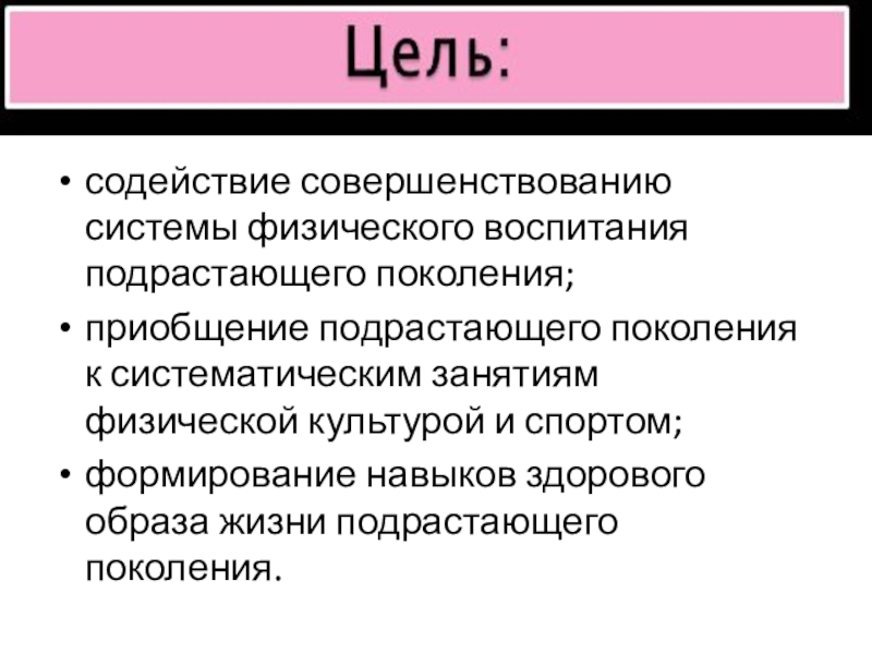 содействие совершенствованию системы физического воспитания подрастающего поколения;приобщение подрастающего поколения к систематическим занятиям физической культурой и спортом;формирование навыков