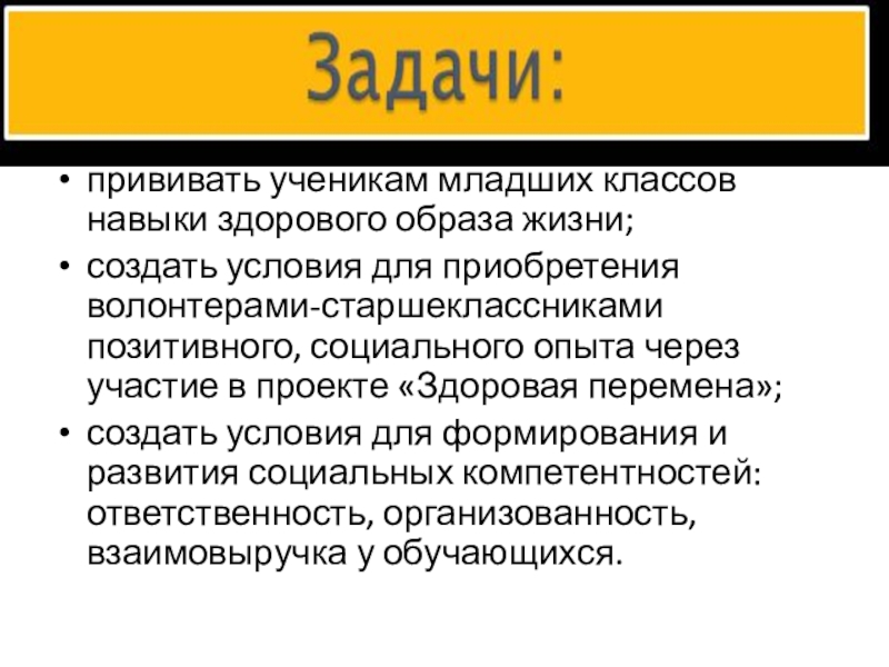 прививать ученикам младших классов навыки здорового образа жизни;создать условия для приобретения волонтерами-старшеклассниками позитивного, социального опыта через участие