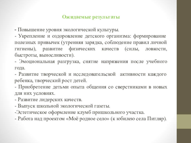 Цель программы: расширить знания обучающихся об окружающей живой природе, способствовать формированию бережного отношения к ней, способствовать оздоровлению и физическому совершенствованию ребят и показать учащимся, что в природе всё взаимосвязано, что истоки народа находятся в далёкой древности, помочь им понять, для чего человек должен изучать и знать природу родного края.
