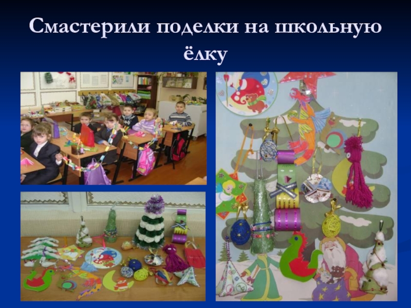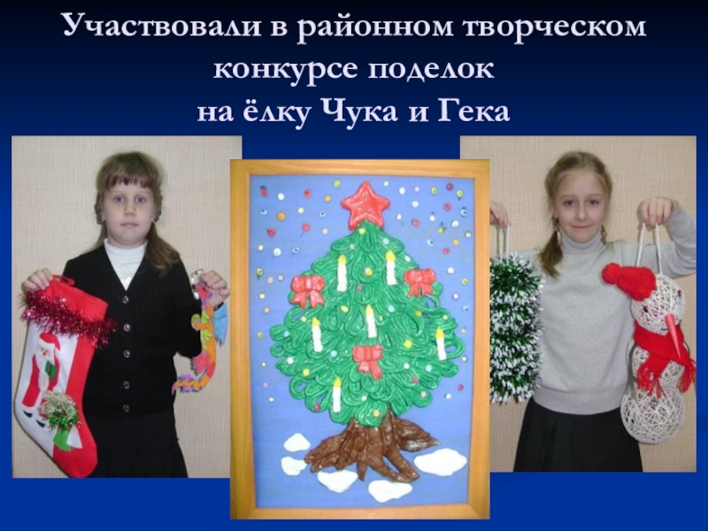 Слайд 10Участвовали в районном творческом конкурсе поделок на ёлку Чука и Гека