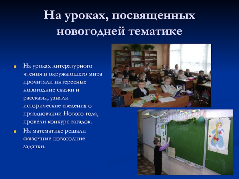 На уроках, посвященных новогодней тематикеНа уроках литературного чтения и окружающего мира прочитали интересные новогодние сказки и рассказы,