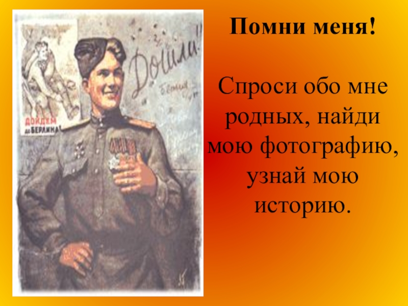 Слайд 5 Помни меня! Спроси обо мне родных, найди мою фотографию, узнай мою историю.