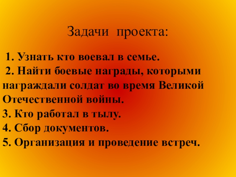 Задачи проекта: 1. Узнать кто воевал в семье. 2. Найти боевые награды, которыми  награждали солдат во
