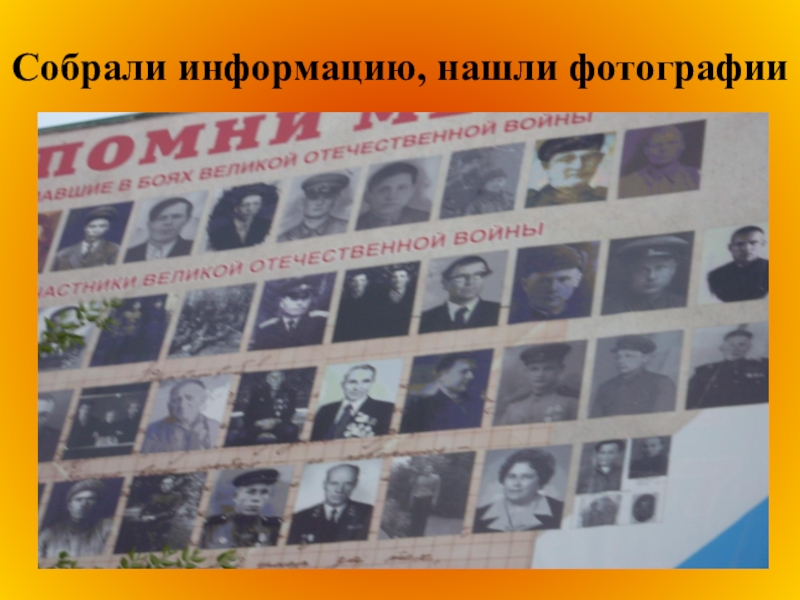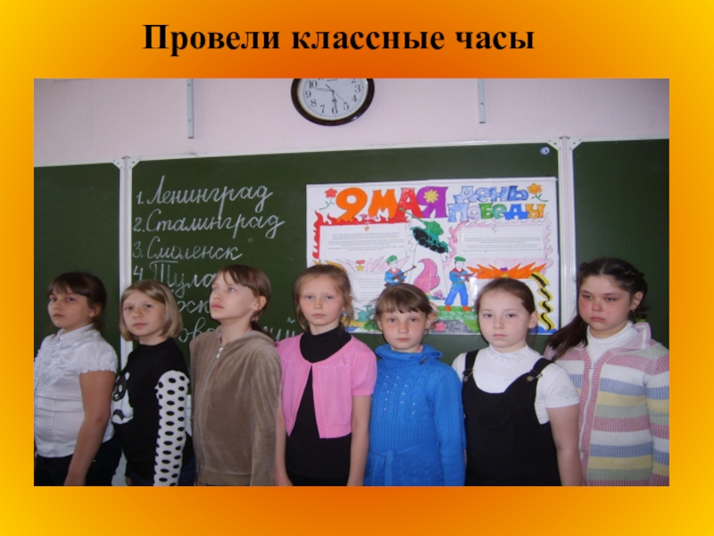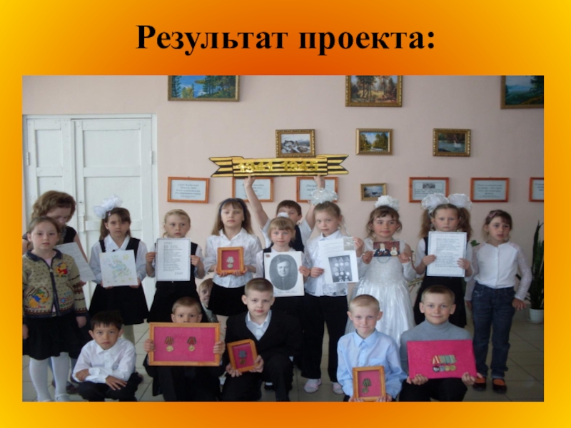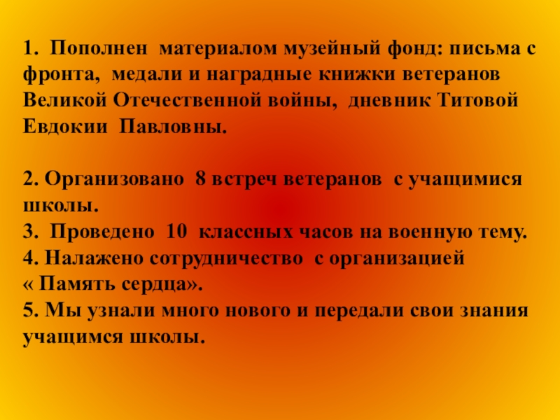книжки ветеранов Великой Отечественной войны, дневник Титовой Евдокии Павловны. 2. Организовано 8 встреч ветеранов с учащимися школы. 3. Проведено 10 классных часов на военную тему. 4. Налажено сотрудничество с организацией « Память сердца». 5. Мы узнали много нового и передали свои знания учащимся школы.