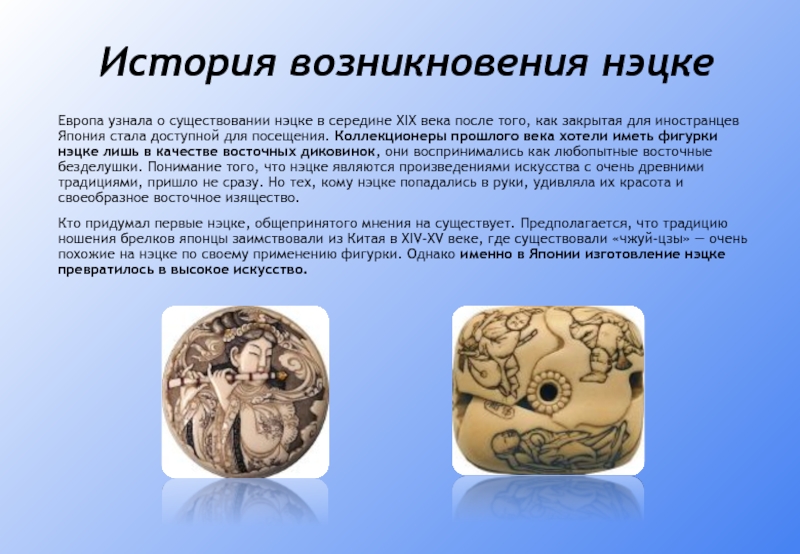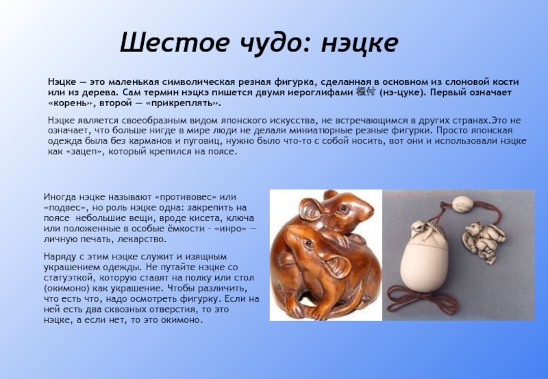 Наряду с этим нэцке служит и изящным украшением одежды. Не путайте нэцке со статуэткой, которую ставят на полку или стол (окимоно) как украшение. Чтобы различить, что есть что, надо осмотреть фигурку. Если на ней есть два сквозных отверстия, то это нэцке, а если нет, то это окимоно.