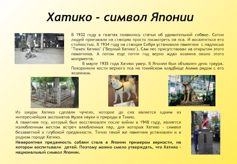 Невероятная преданность собаки стала в Японии примером верности, на котором воспитывали детей. Поэтому можно смело утверждать, что Хатико - национальный символ Японии.