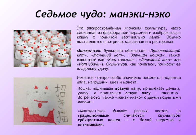 Манэки-нэко буквально обозначает «Приглашающий кот», «Манящий кот», «Зовущая кошка»; также известный как «Кот счастья», «Денежный кот» или «Кот удачи»). Скульптура, как полагают, приносит её владельцу удачу.