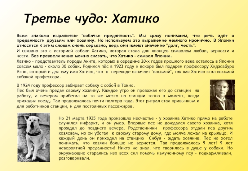 Но 21 марта 1925 года произошло несчастье - у хозяина Хатико прямо на работе случился инфаркт, и он умер. Впервые пес не дождался своего хозяина, хотя прождал до позднего вечера. Родственники профессора отдали пса другим хозяевам, но он убегал к своему старому дому, где молча лежал на крыльце. И каждый день он приходил на станцию Сибуя - ждать хозяина. Пес не хотел понимать, что хозяин больше не вернется. Так продолжалось 9 лет! 9 лет невероятной преданности! Никто не знал, что творилось в душе у собаки. Но окружающие старались изо всех сил помочь измученному псу - подкармливали, разговаривали.
