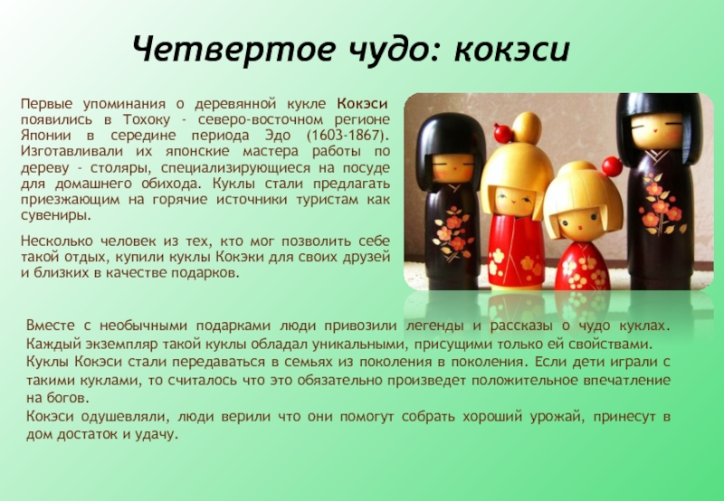 Куклы Кокэси стали передаваться в семьях из поколения в поколения. Если дети играли с такими куклами, то считалось что это обязательно произведет положительное впечатление на богов.