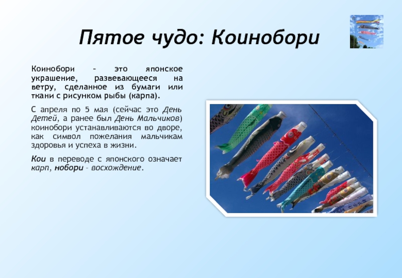 А вот Японские дети часто мастерят коинобори из бумаги и украшают их аппликацией или раскрашивают.
