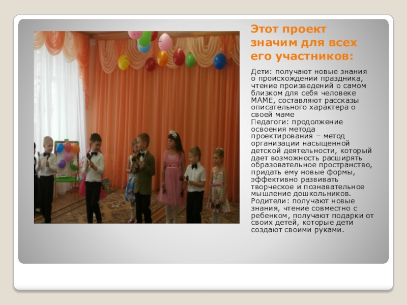 Этот проект значим для всех его участников:Дети: получают новые знания о происхождении праздника, чтение произведений о самом