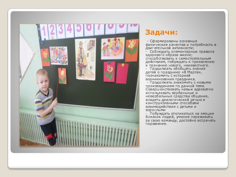 - Продолжать обобщать знания детей о празднике «8 Марта», познакомить с историей возникновения праздника.