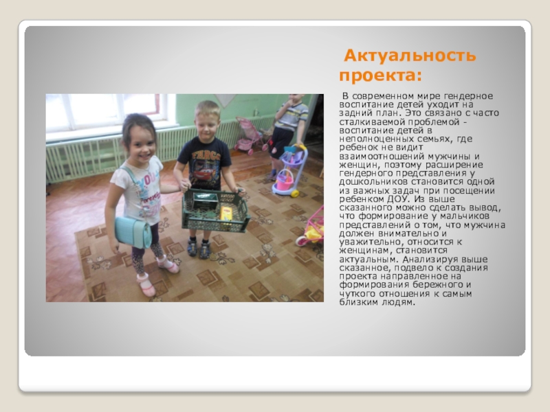 Актуальность проекта: В современном мире гендерное воспитание детей уходит на задний план. Это связано с часто