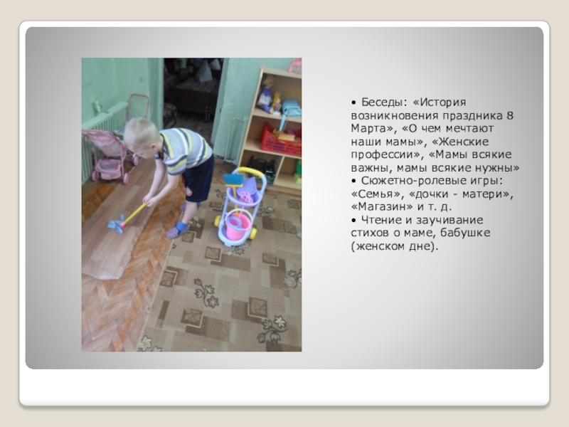 Слайд 7• Беседы: «История возникновения праздника 8 Марта», «О чем мечтают наши
