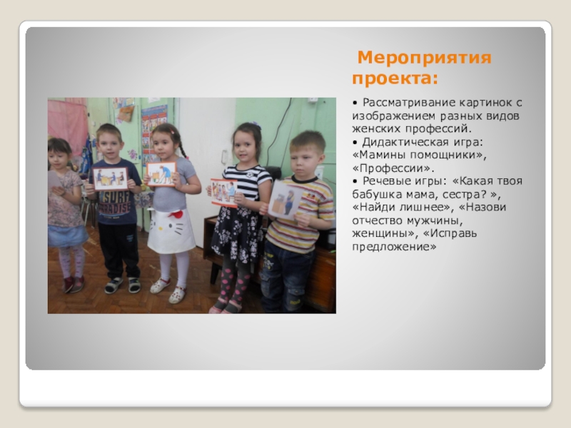 Мероприятия проекта:• Рассматривание картинок с изображением разных видов женских профессий.• Дидактическая игра: «Мамины помощники», «Профессии».• Речевые