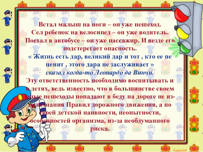 Эту ответственность необходимо воспитывать и в детях, ведь известно, что в большинстве своем юные пешеходы попадают в беду на дороге не из-за незнания Правил дорожного движения, а по своей детской наивности, неопытности, особенностей организма, из-за необдуманного риска.
