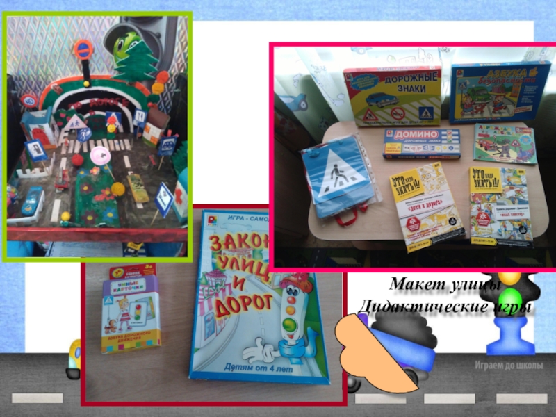 Настольно-печатные игры: «Умный пешеход», «Дети на улице города», «Исправь ситуацию», «Мы идём в детский сад», Умный светофор», «Лото «Дорожные знаки»,