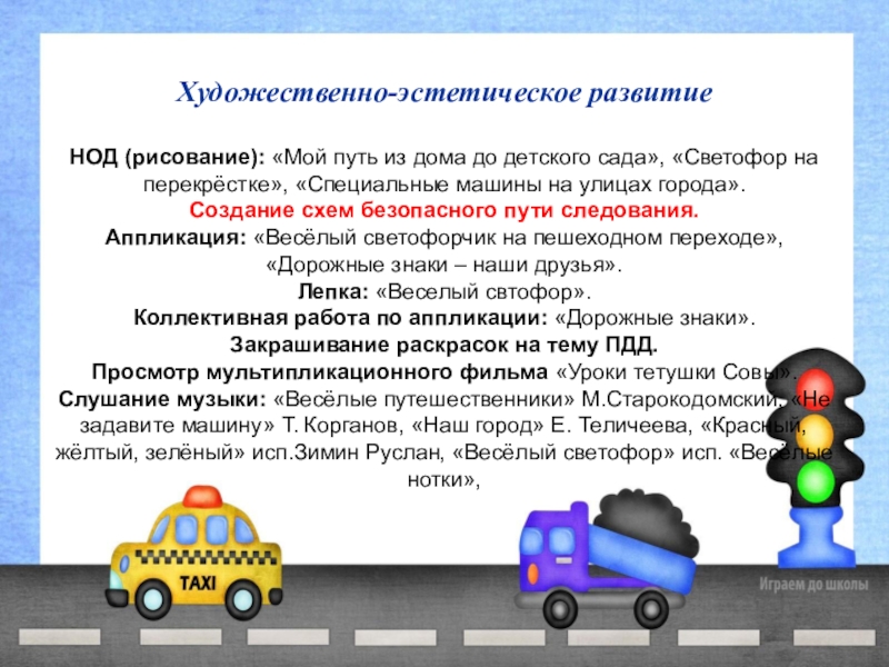 Слушание музыки: «Весёлые путешественники» М.Старокодомский, «Не задавите машину» Т. Корганов, «Наш город» Е. Теличеева, «Красный, жёлтый, зелёный» исп.Зимин Руслан, «Весёлый светофор» исп. «Весёлые нотки»,