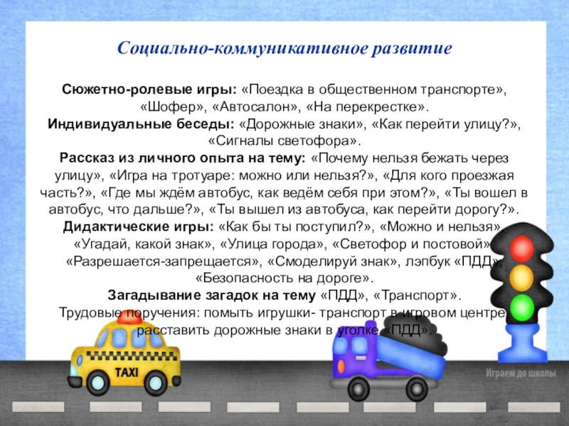Сюжетно-ролевые игры: «Поездка в общественном транспорте», «Шофер», «Автосалон», «На перекрестке».