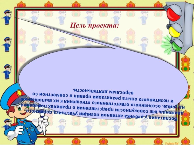 Воспитание у ребенка активной позиции участника дорожного движения, как совокупности представлений о правилах поведения на улице, осознанного ответственного отношения к их выполнению и позитивного опыта реализации правил в совместной со взрослым деятельности.