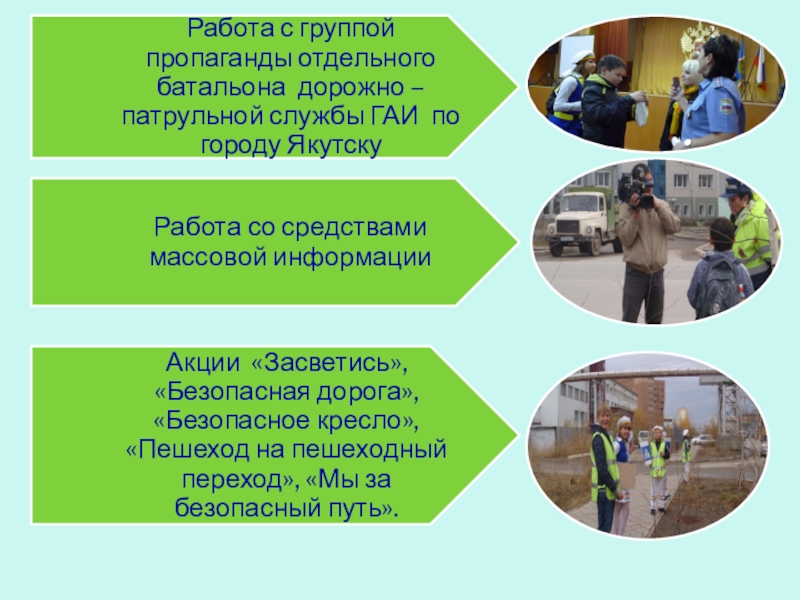 Акции «Засветись», «Безопасная дорога», «Безопасное кресло», «Пешеход на пешеходный переход», «Мы за безопасный путь».