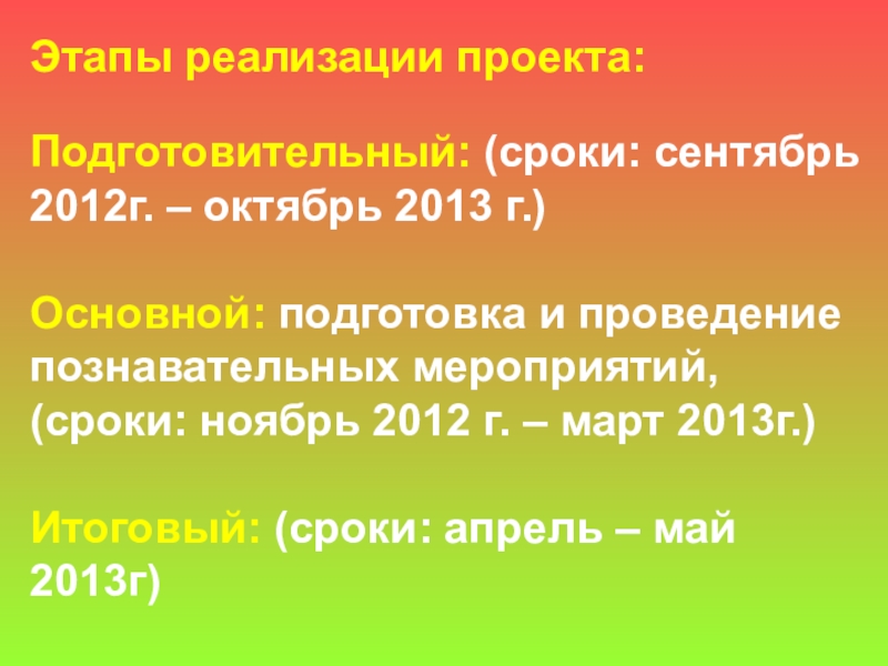 Этапы реализации проекта:Подготовительный: (сроки: сентябрь 2012г. – октябрь 2013 г.)Основной: подготовка и проведение познавательных мероприятий, (сроки: ноябрь