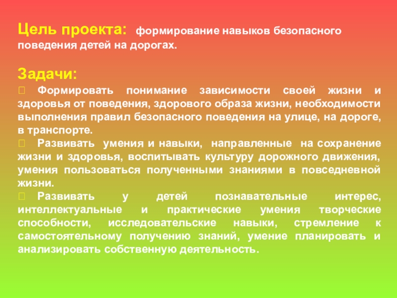 Цель проекта: формирование навыков безопасного поведения детей на дорогах. Задачи: Формировать понимание зависимости своей жизни и здоровья от поведения, здорового образа жизни, необходимости выполнения правил безопасного поведения на улице, на дороге, в транспорте. Развивать умения и навыки, направленные