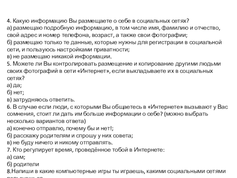 Слайд 84. Какую информацию Вы размещаете о себе в социальных сетях?