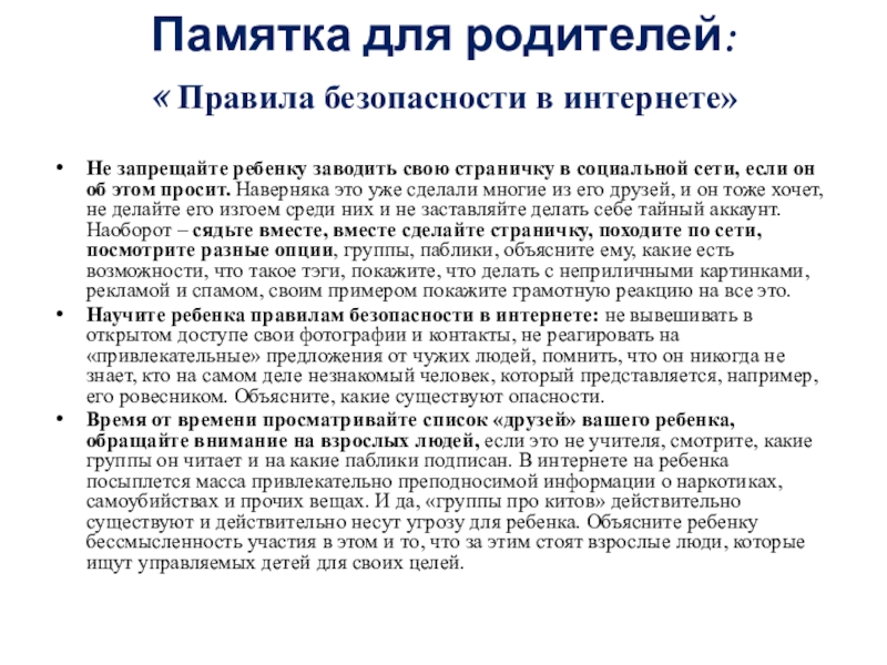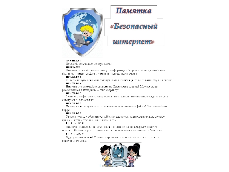 2. Ознакомить родителей с итогами анкетирования учащихся и с памяткой «Правила безопасности в интернете»