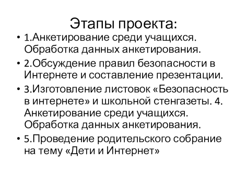 3.Изготовление листовок «Безопасность в интернете» и школьной стенгазеты. 4.Анкетирование среди учащихся. Обработка данных анкетирования.