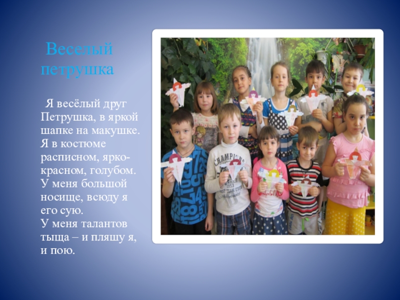 Я весёлый друг Петрушка, в яркой шапке на макушке.
