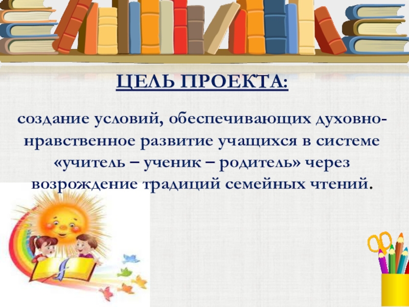 Цель проекта:создание условий, обеспечивающих духовно-нравственное развитие учащихся в системе «учитель – ученик – родитель» через возрождение традиций