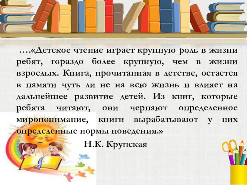 ….«Детское чтение играет крупную роль в жизни ребят, гораздо более крупную, чем в жизни взрослых. Книга, прочитанная в детстве, остается в памяти чуть ли не на всю жизнь и влияет на дальнейшее развитие детей.