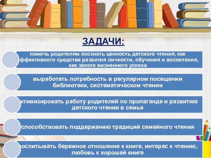 2. Совместная работа семьи, школы и библиотеки по организации чтения и формирования читательской деятельности. Включает совместную работу семьи и библиотеки по организации чтения и формированию читательской деятельности.