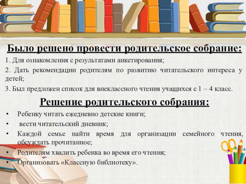 Было решено провести родительское собрание:1. Для ознакомления с результатами анкетирования;2. Дать рекомендации родителям по развитию читательского интереса