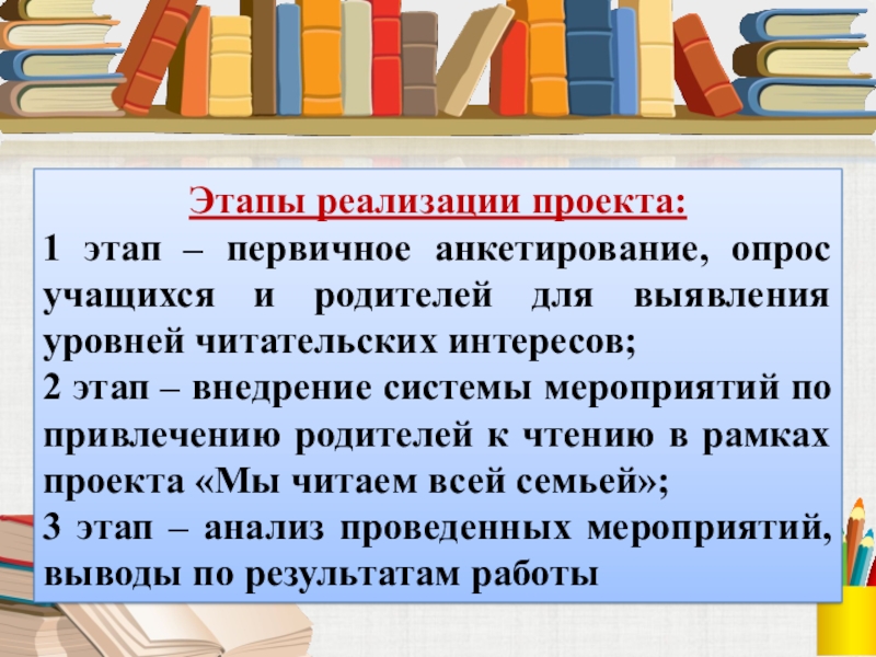 Этапы реализации проекта:1 этап – первичное анкетирование, опрос учащихся и родителей для выявления уровней читательских интересов;2 этап