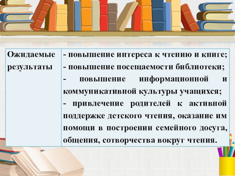 Выводы:   В библиотеках появятся новые союзники и единомышленники из числа родителей, увеличится число читателей, а