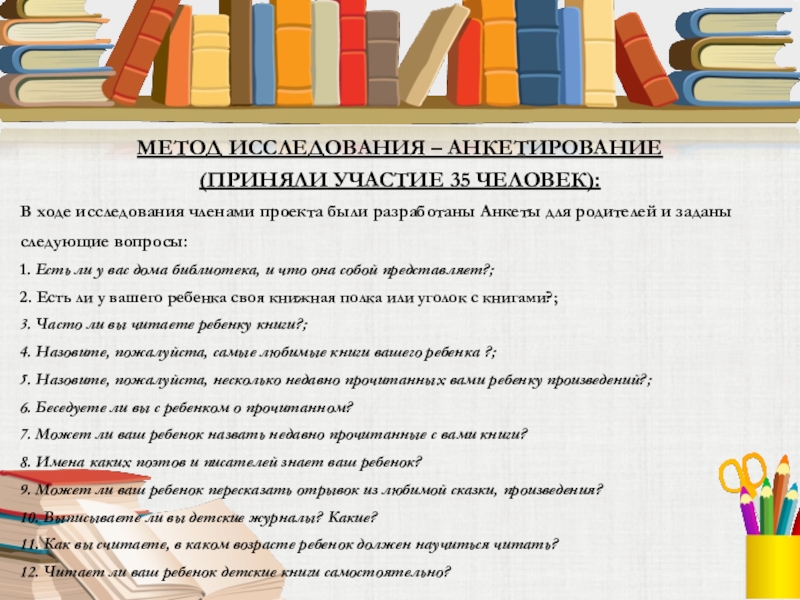 Метод исследования – анкетирование (приняли участие 35 человек):В ходе исследования членами проекта были разработаны Анкеты для родителей