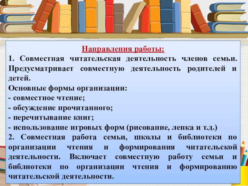 Направления работы:1. Совместная читательская деятельность членов семьи. Предусматривает совместную деятельность родителей и детей.Основные формы организации:- совместное чтение;-