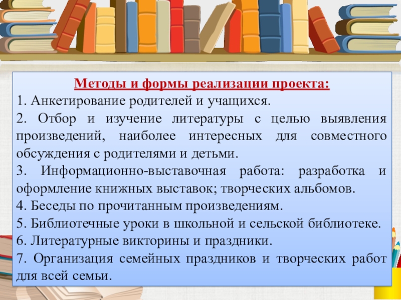 Методы и формы реализации проекта: 1. Анкетирование родителей и учащихся. 2. Отбор и изучение литературы с целью
