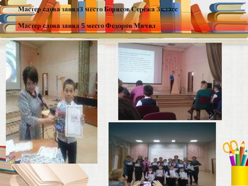 Мастер слова занял3 место Борисов Сережа 3класс  Мастер слова занял 5 место Федоров Мичил