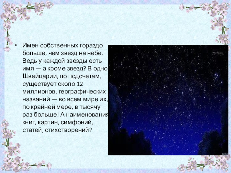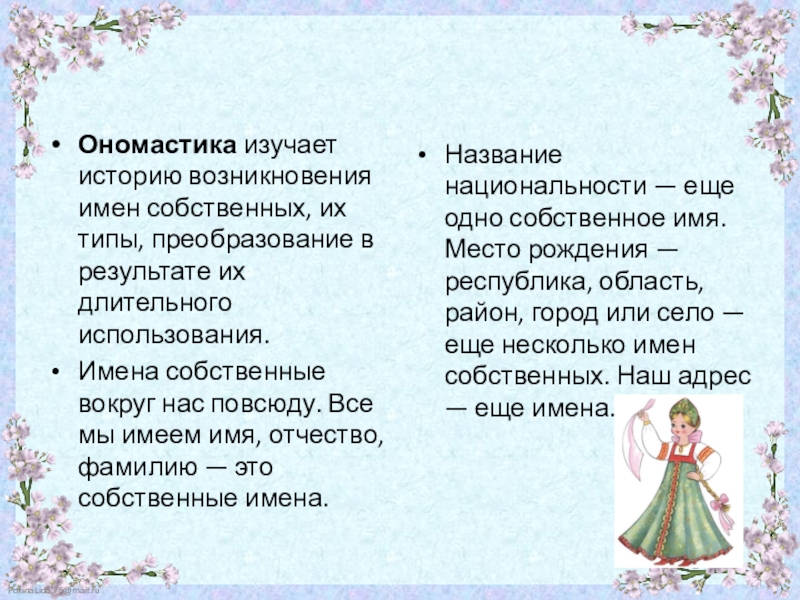 Название национальности — еще одно собственное имя. Место рождения — республика, область, район, город или село — еще несколько имен собственных. Наш адрес — еще имена.