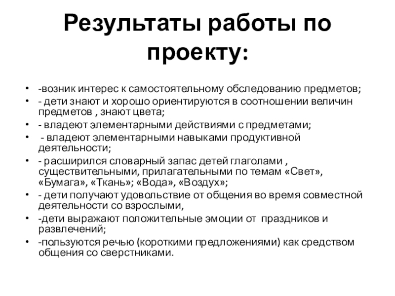 - расширился словарный запас детей глаголами , существительными, прилагательными по темам «Свет», «Бумага», «Ткань»; «Вода», «Воздух»;