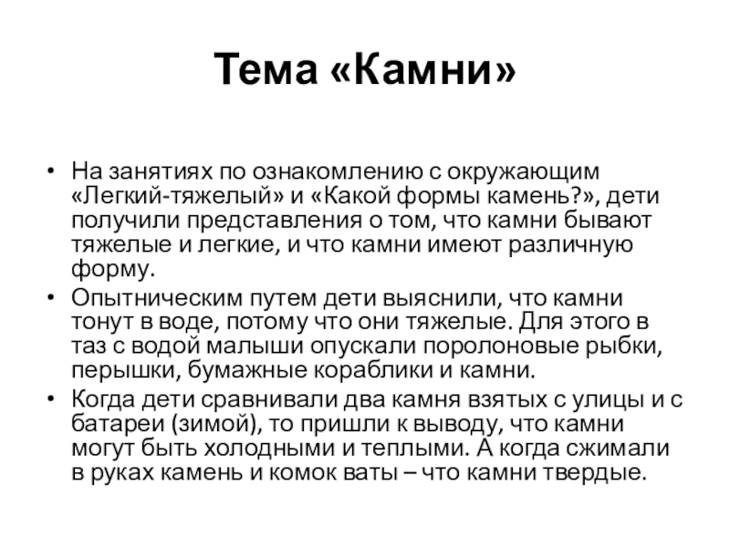 камень?», дети получили представления о том, что камни бывают тяжелые и легкие, и что камни имеют различную форму.