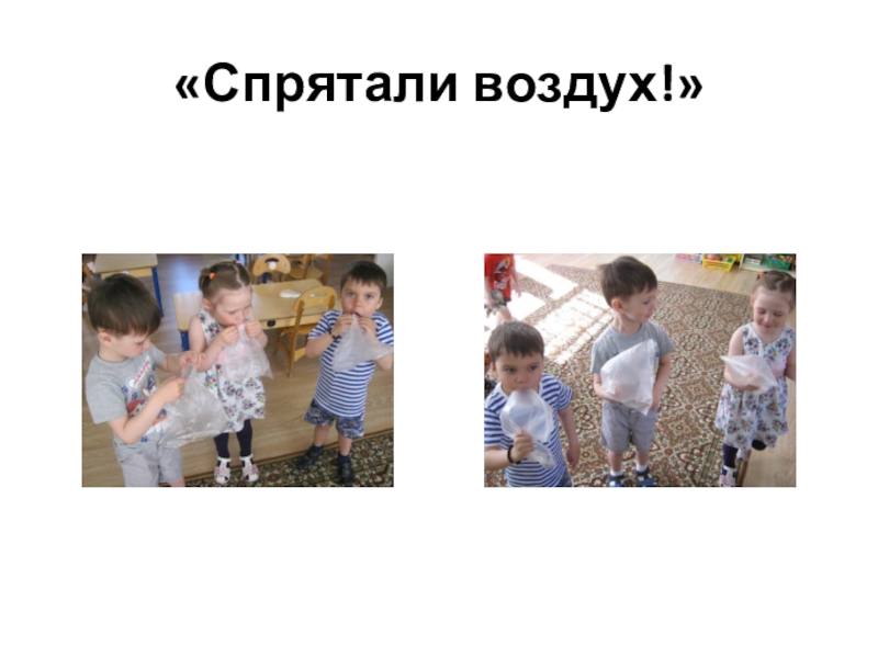 При проведении дидактической игры «Поймаем воздух» дети «ловили» воздух в полиэтиленовые пакеты и убедились в том, что воздух не виден, но он есть. В игре «Буря в стакане» малыши дули через соломинку в стакан с водой и увидели, что вода вымещает воздух. Играя в игру «Мой веселый звонкий мяч» дети узнали, что мячик прыгает высоко, потому что в нём много воздуха.